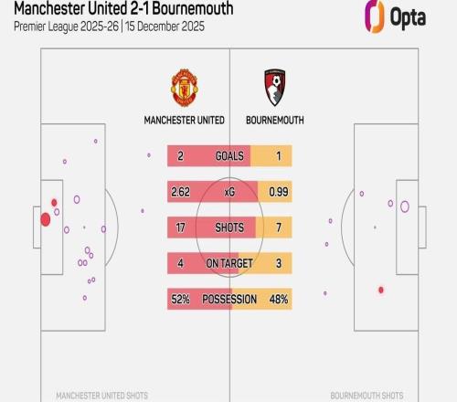 英超第16轮,曼联主场对阵伯恩茅斯,上半场战罢曼联2-1领先,上半场比赛,两队一共完成24次射门(曼联17次),在对方禁...